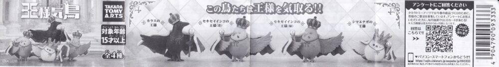 「カラスの王様」「シマエナガの王様」「セキセイインコの王様(緑)」「セキセイインコの王様(青)」の全4種です。